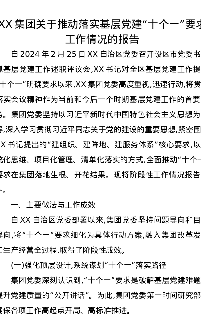 XX集团关于推动落实基层党建“十个一”要求工作情况的报告