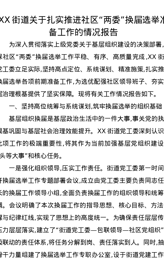 XX街道关于扎实推进社区“两委”换届选举准备工作的情况报告