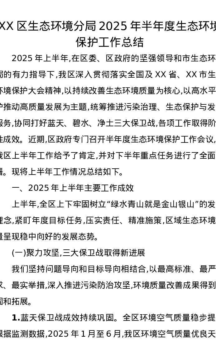 XX区生态环境分局2025年半年度生态环境保护工作总结