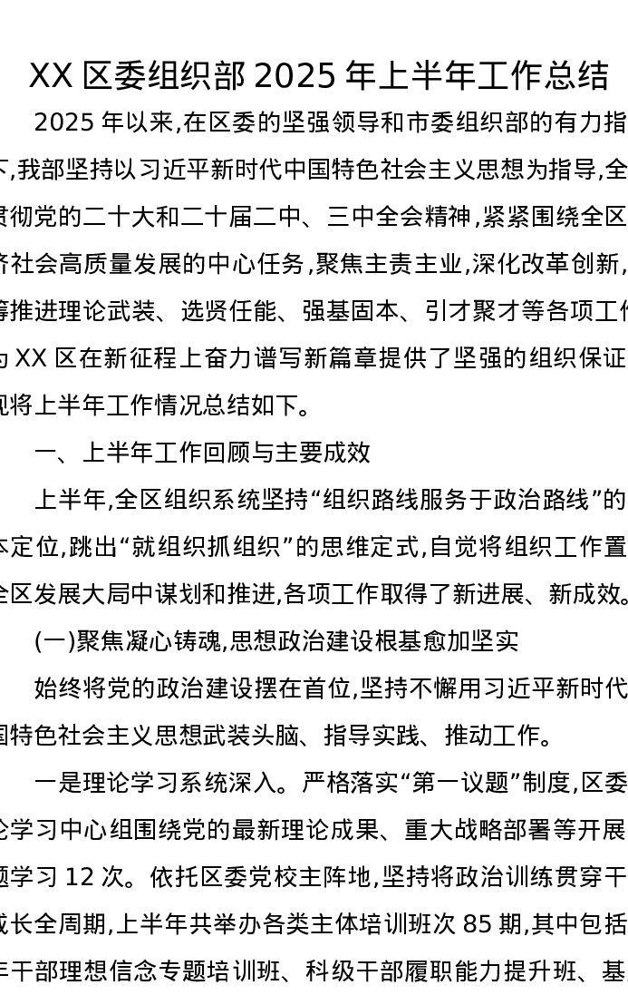 XX区委组织部2025年上半年工作总结