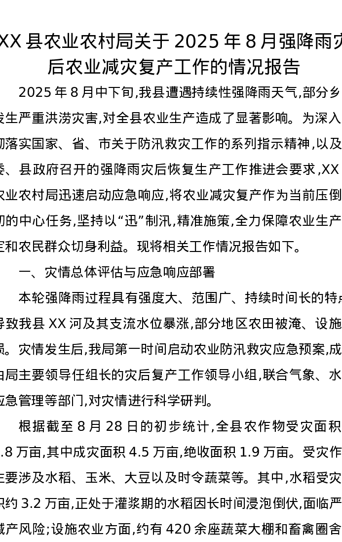 XX县农业农村局关于2025年8月强降雨灾后农业减灾复产工作的情况报告