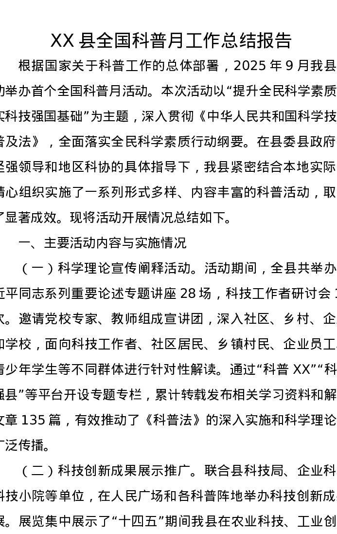 XX县全国科普月工作总结报告