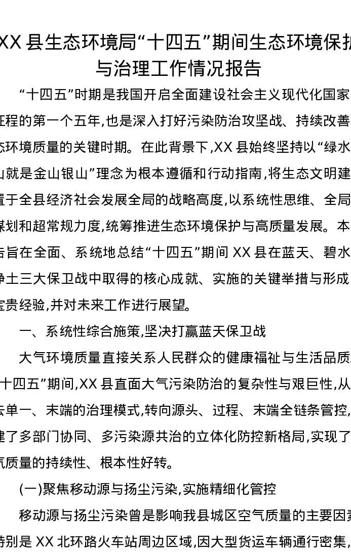 XX县生态环境局“十四五”期间生态环境保护与治理工作情况报告
