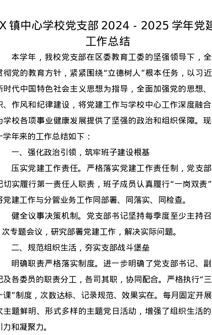 X镇中心学校党支部2024-2025学年党建工作总结
