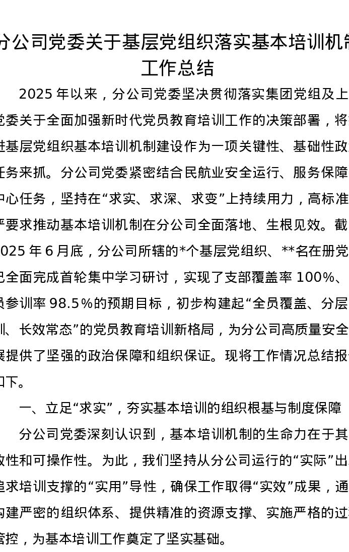 分公司党委关于基层党组织落实基本培训机制工作总结