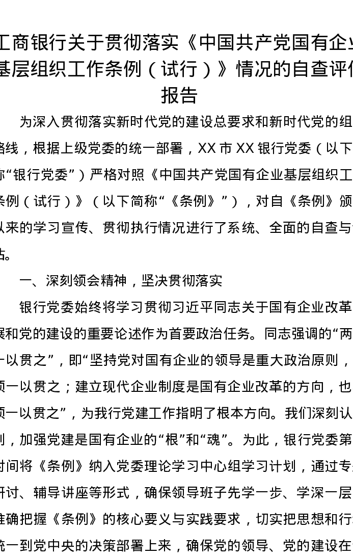 工商银行关于贯彻落实《中国共产党国有企业基层组织工作条例(试行)》情况的自查评估报告