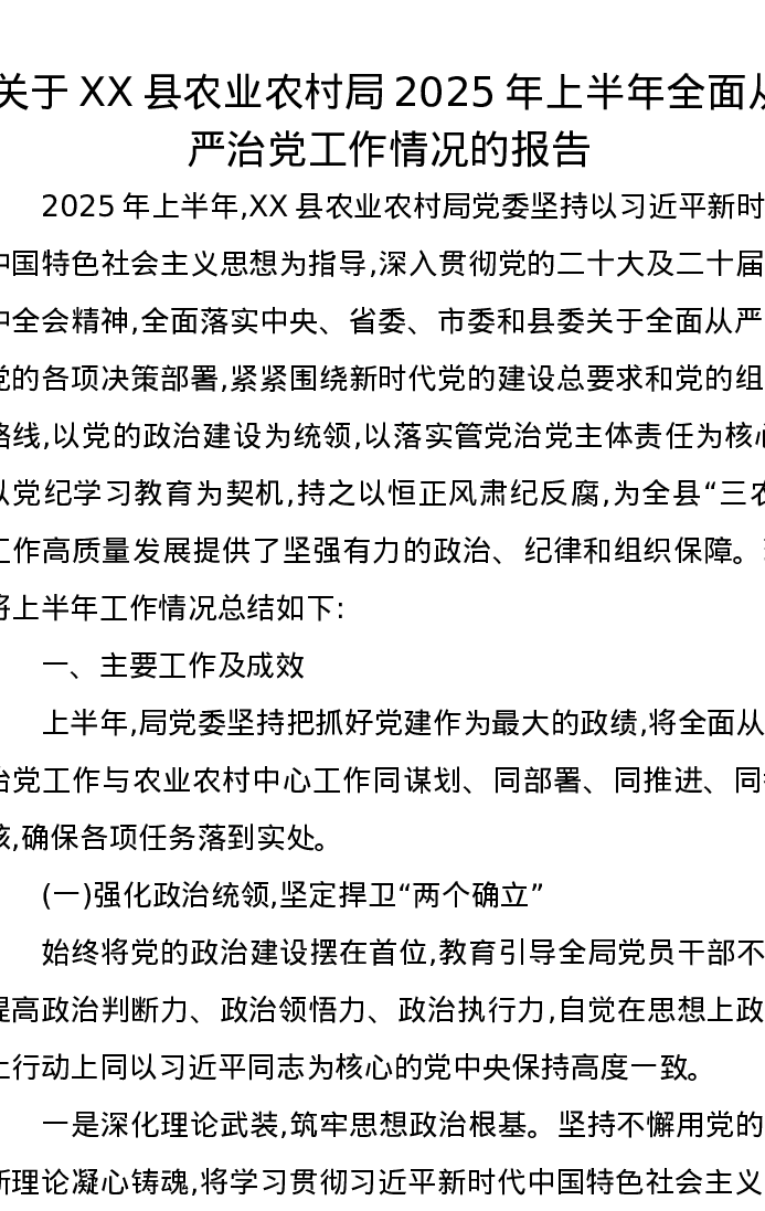 关于XX县农业农村局2025年上半年全面从严治党工作情况的报告