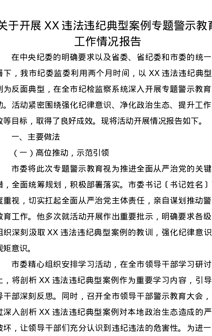 关于开展XX违法违纪典型案例专题警示教育工作情况报告