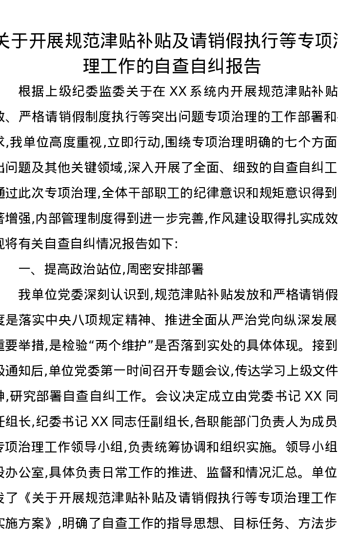 关于开展规范津贴补贴及请销假执行等专项治理工作的自查自纠报告