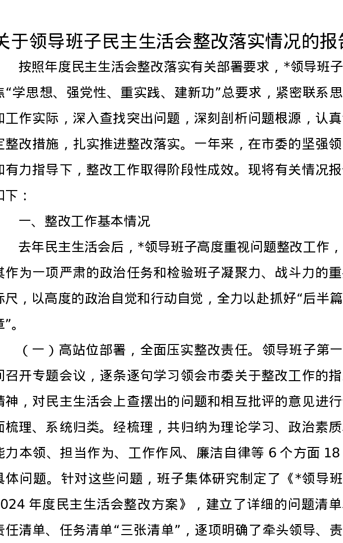 关于领导班子民主生活会整改落实情况的报告