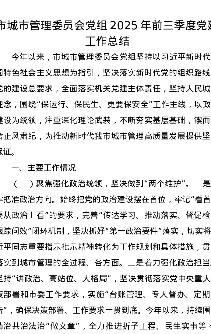 市城市管理委员会党组2025年前三季度党建工作总结