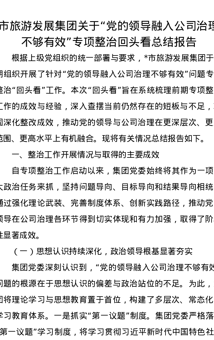 市旅游发展集团关于“党的领导融入公司治理不够有效”专项整治回头看总结报告