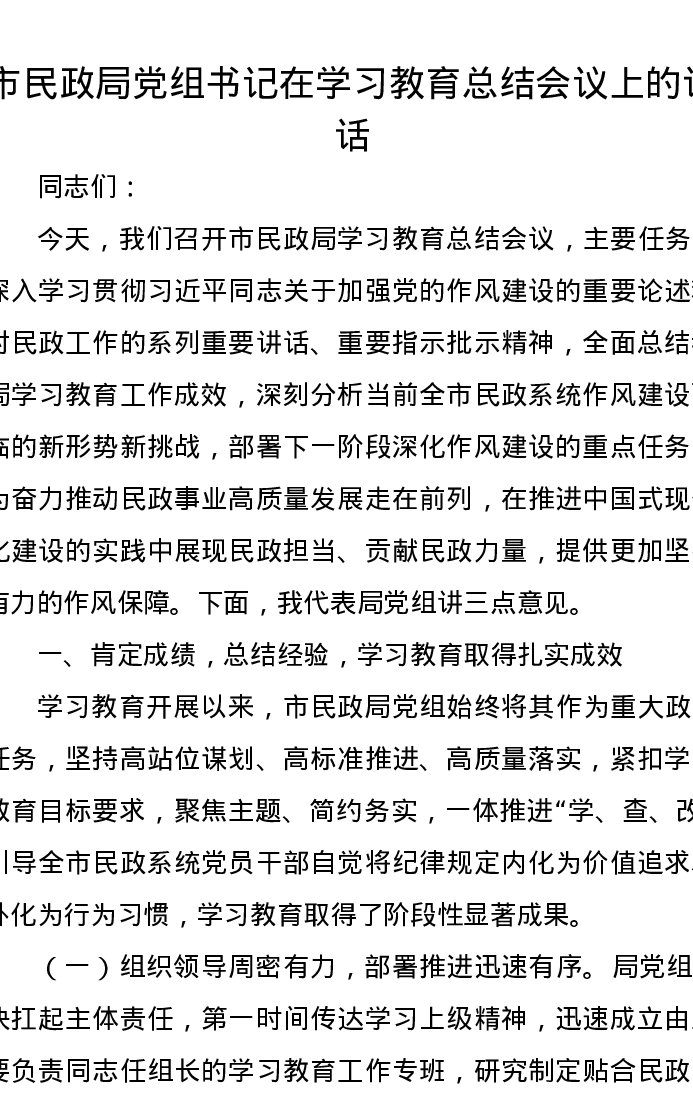 市民政局党组书记在学习教育总结会议上的讲话