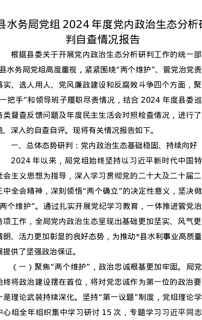 县水务局党组2024年度党内政治生态分析研判自查情况报告