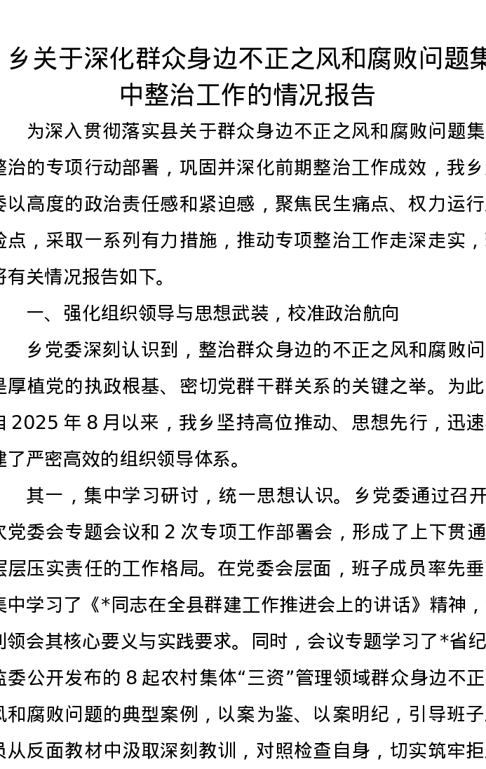乡关于深化群众身边不正之风和腐败问题集中整治工作的情况报告