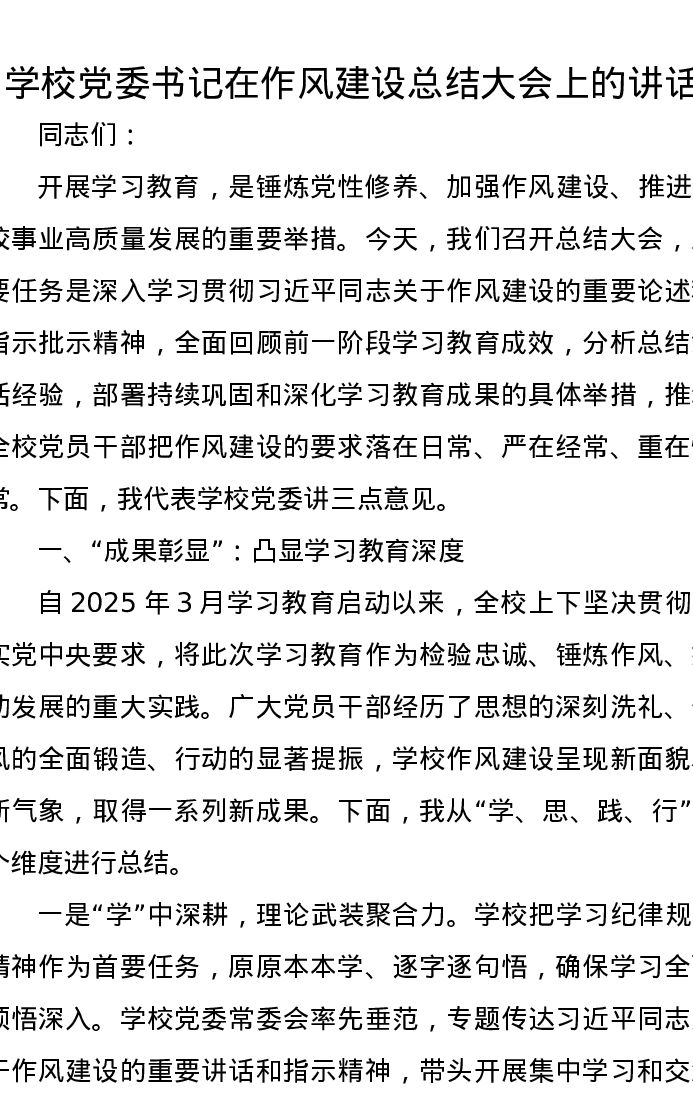 学校党委书记在作风建设总结大会上的讲话