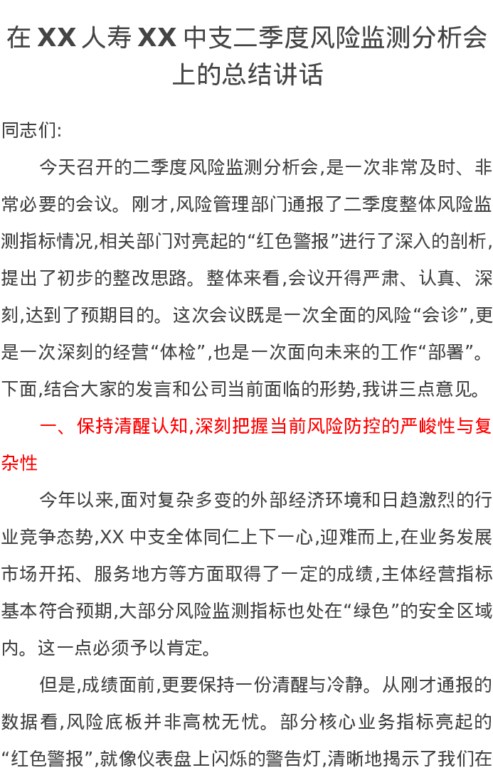 在XX人寿XX中支二季度风险监测分析会上的总结讲话