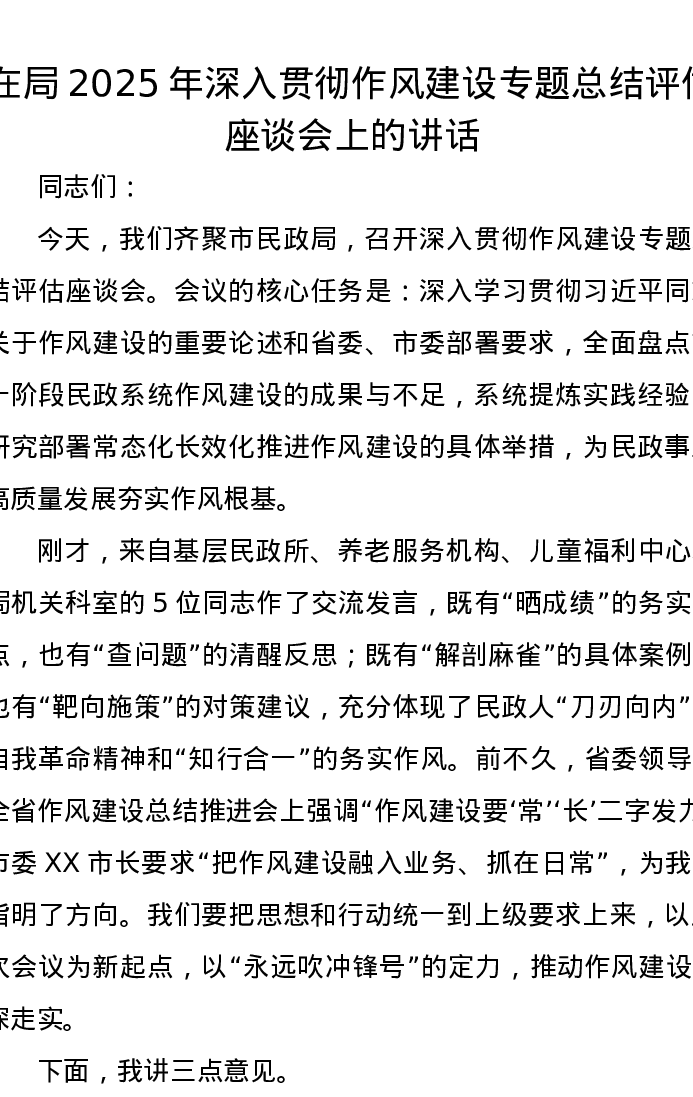 在局2025年深入贯彻作风建设专题总结评估座谈会上的讲话