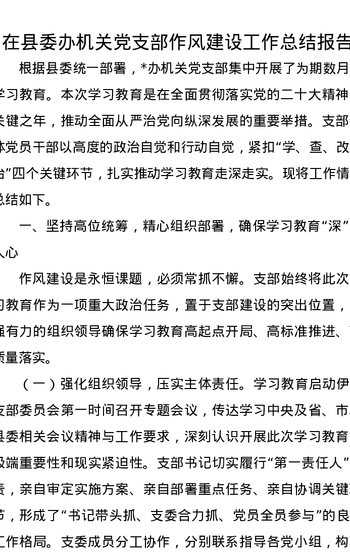 在县委办机关党支部作风建设工作总结报告
