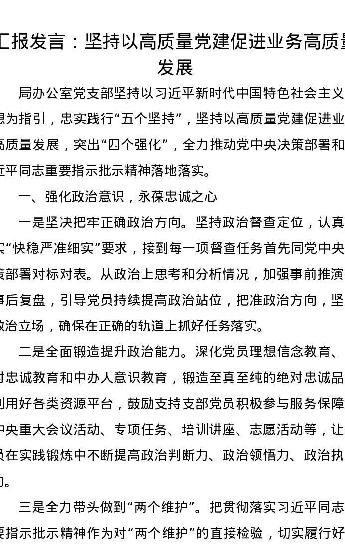 汇报发言:坚持以高质量党建促进业务高质量发展