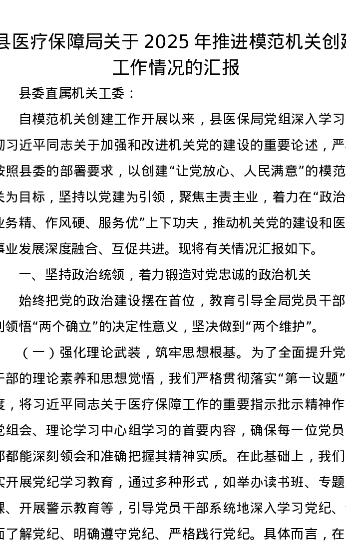 县医疗保障局关于2025年推进模范机关创建工作情况的汇报