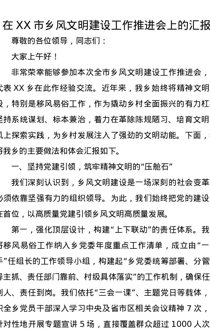 在XX市乡风文明建设工作推进会上的汇报