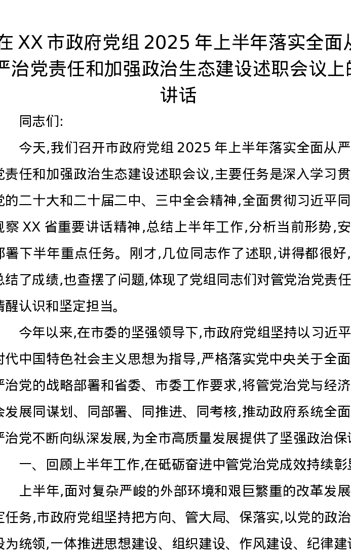 在XX市政府党组2025年上半年落实全面从严治党责任和加强政治生态建设述职会议上的讲话