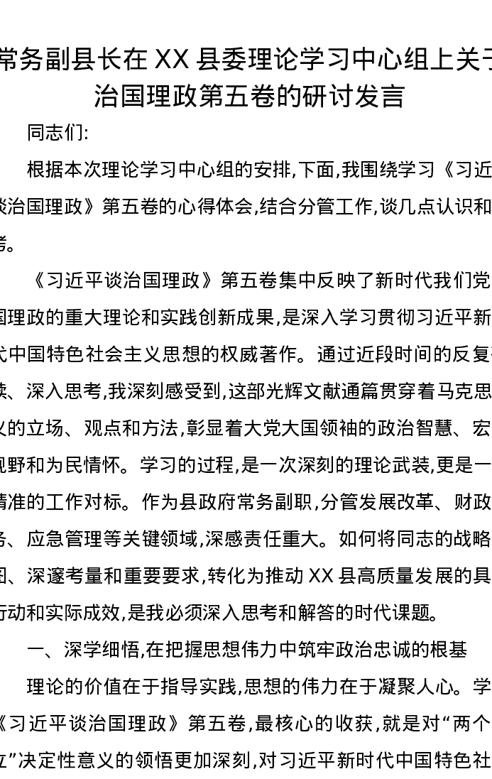 常务副县长在XX县委理论学习中心组上关于治国理政第五卷的研讨发言