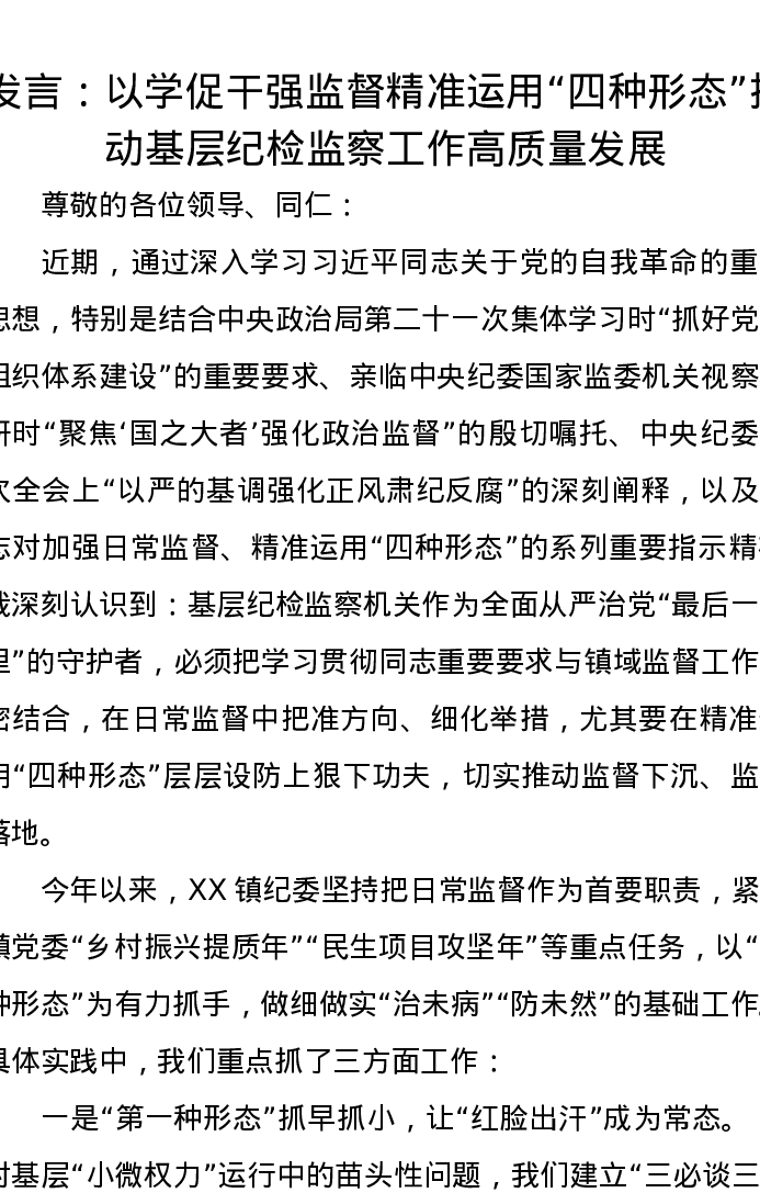发言:以学促干强监督 精准运用“四种形态” 推动基层纪检监察工作高质量发展