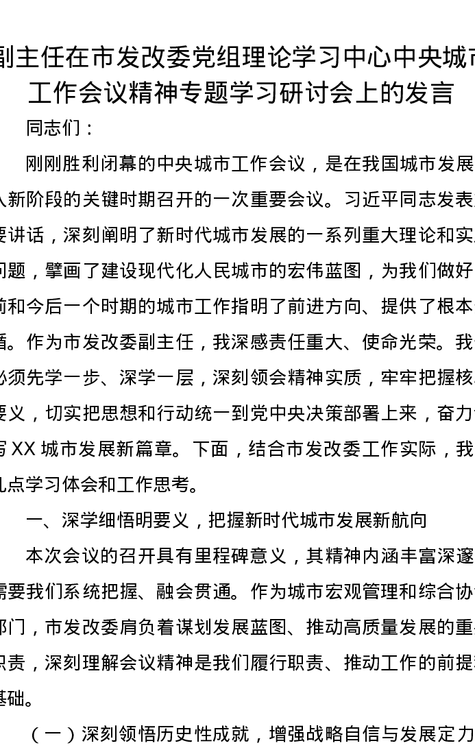 副主任在市发改委党组理论学习中心中央城市工作会议精神专题学习研讨会上的发言