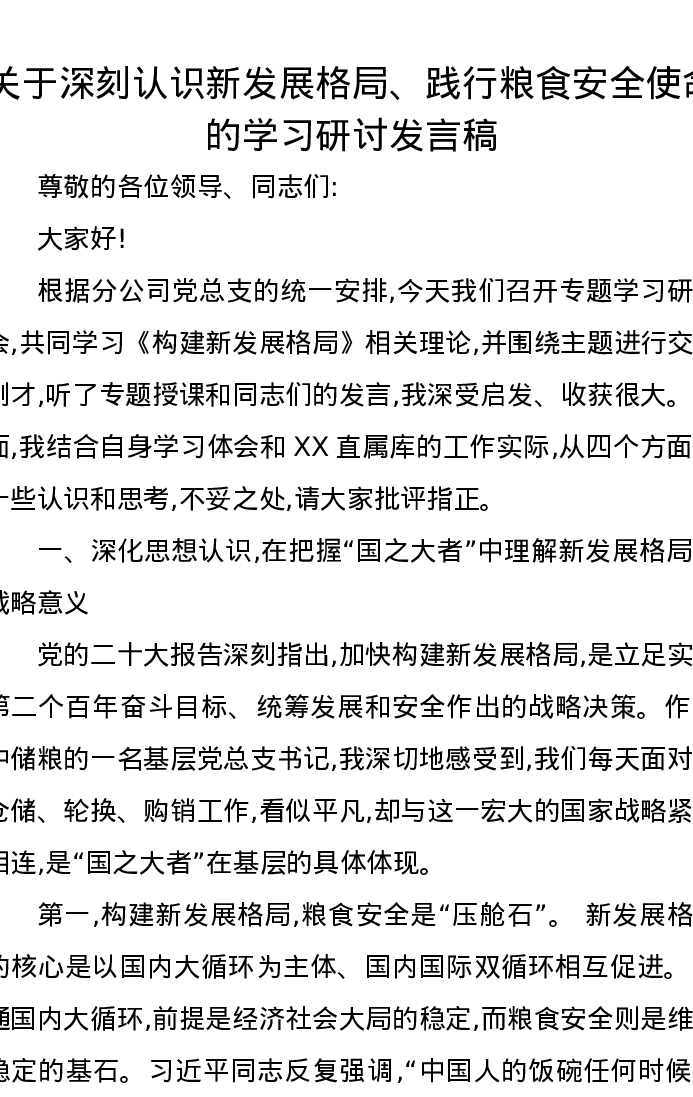 关于深刻认识新发展格局、践行粮食安全使命的学习研讨发言稿