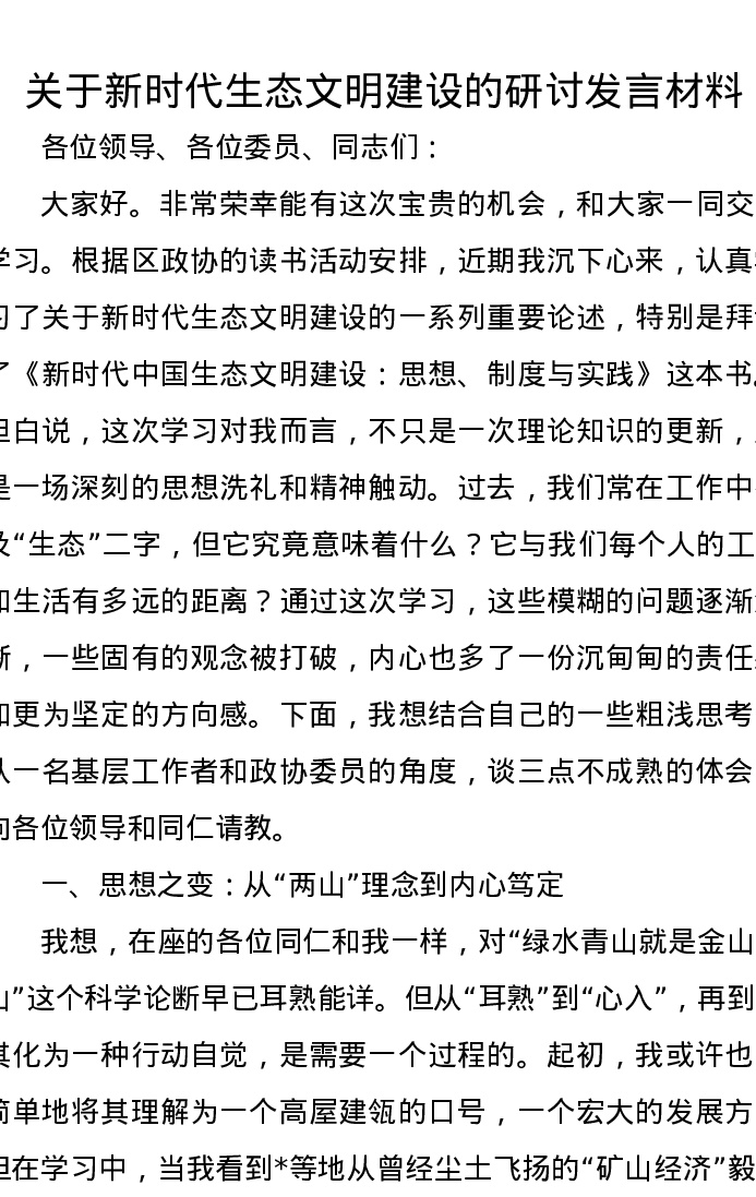 关于新时代生态文明建设的研讨发言材料