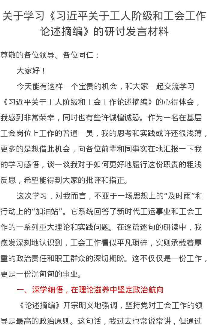 关于学习《习近平关于工人阶级和工会工作论述摘编》的研讨发言材料