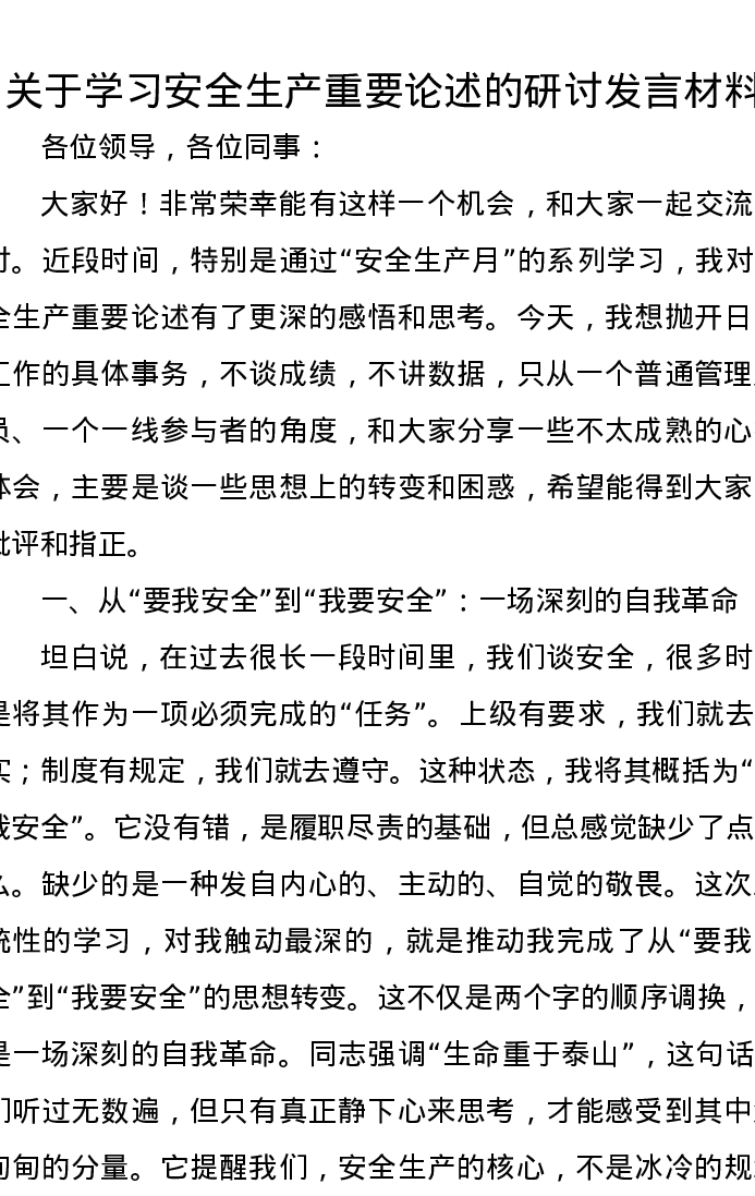 关于学习安全生产重要论述的研讨发言材料