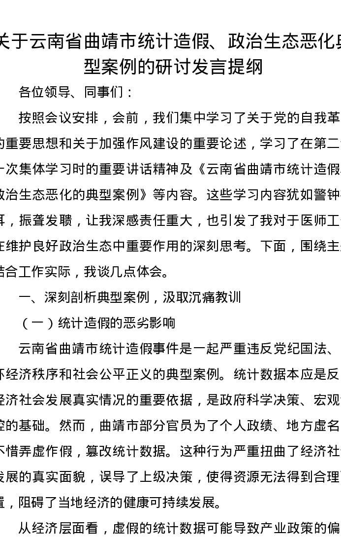 关于云南省曲靖市统计造假、政治生态恶化典型案例的研讨发言提纲