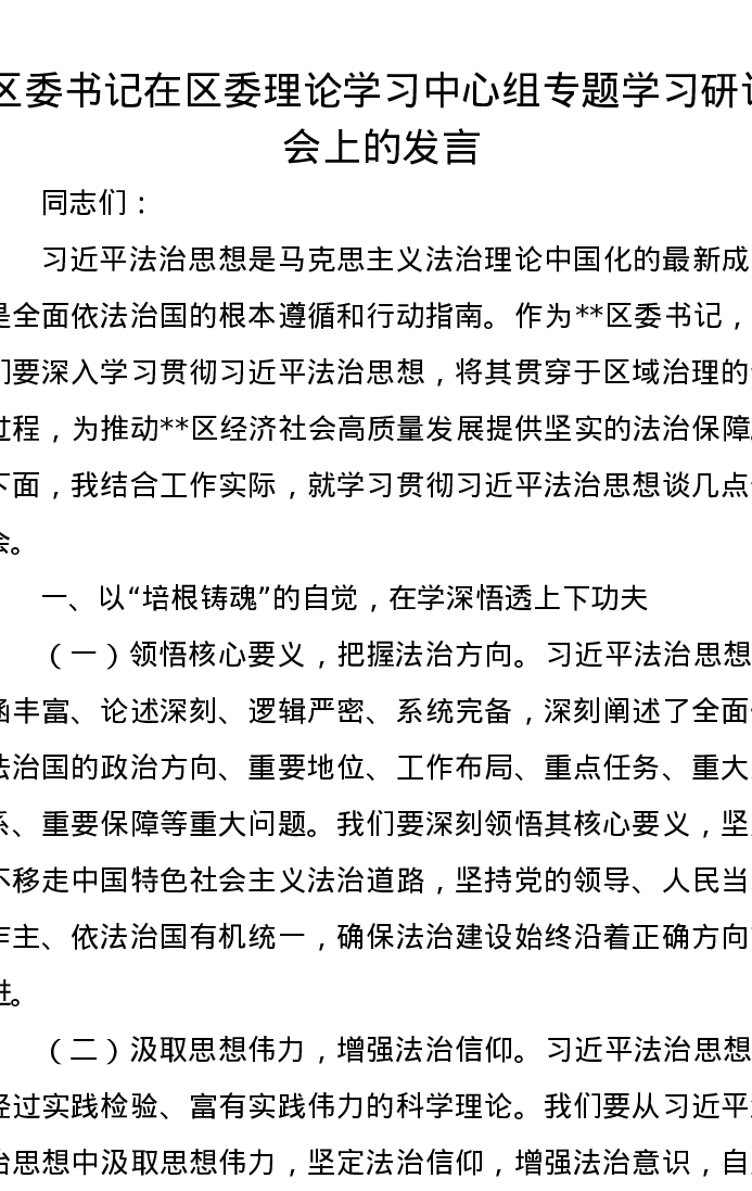 区委书记在区委理论学习中心组专题学习研讨会上的发言