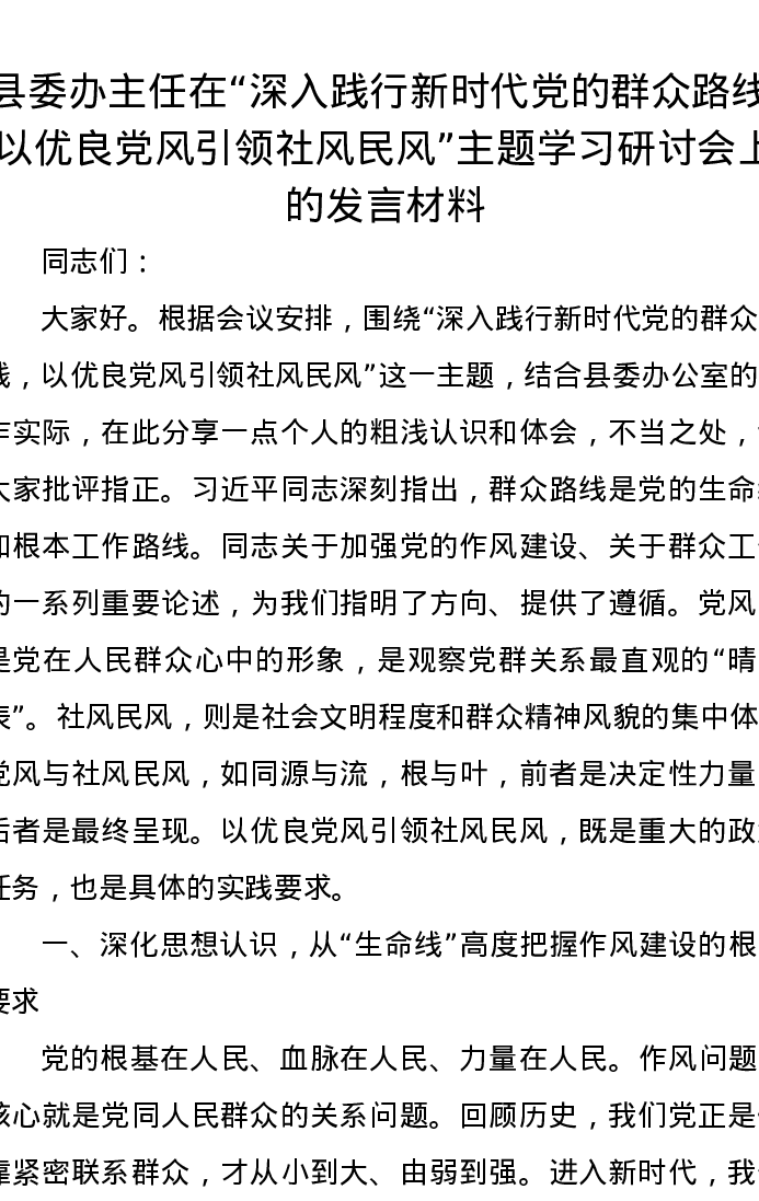 县委办主任在“深入践行新时代党的群众路线,以优良党风引领社风民风”主题学习研讨会上的发言材料