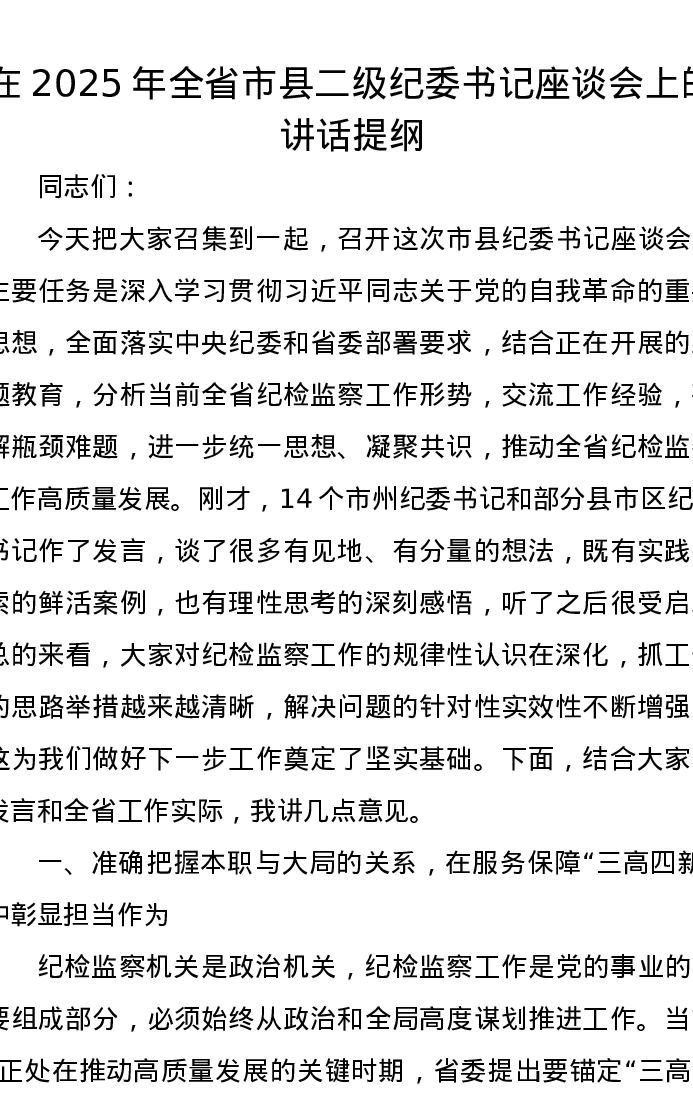 在2025年全省市县二级纪委书记座谈会上的讲话提纲