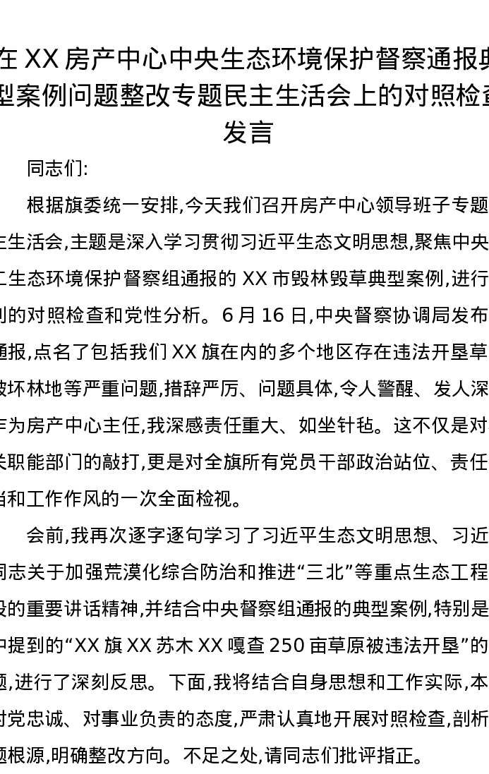 在XX房产中心中央生态环境保护督察通报典型案例问题整改专题民主生活会上的对照检查发言