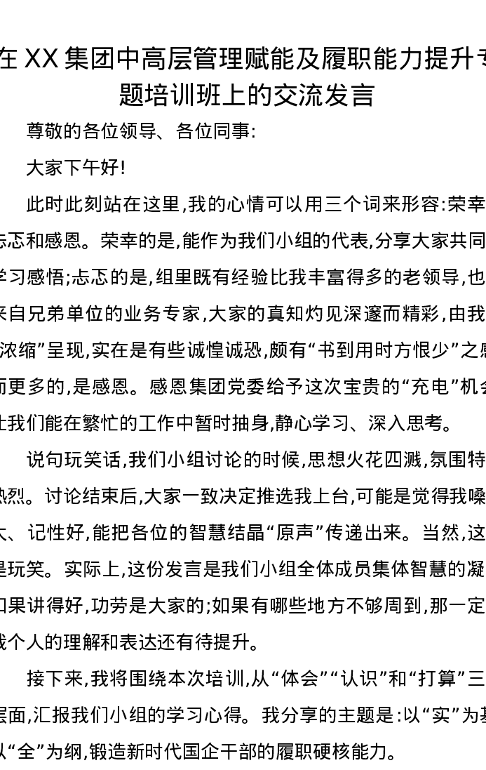 在XX集团中高层管理赋能及履职能力提升专题培训班上的交流发言
