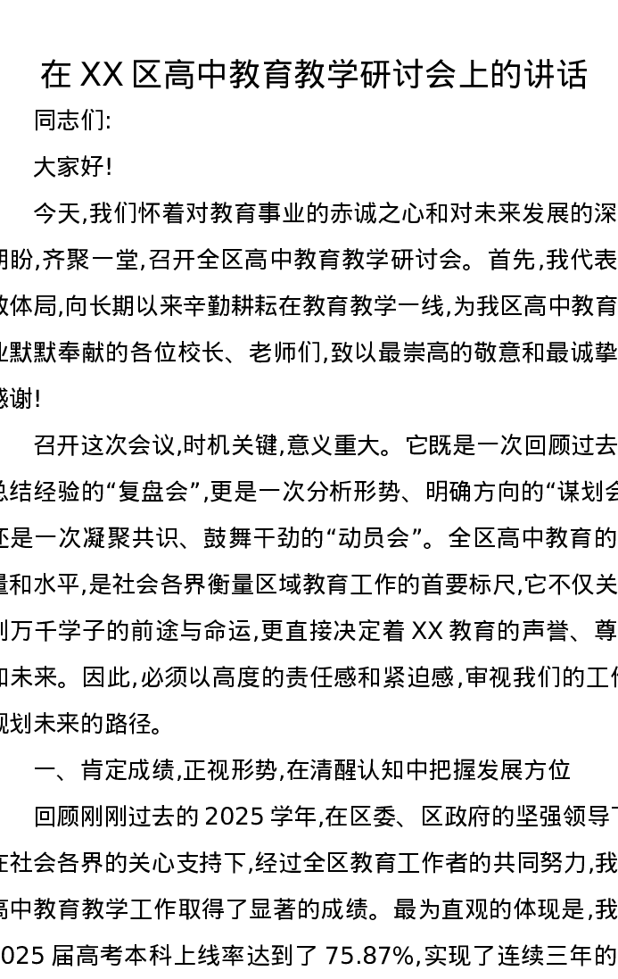 在XX区高中教育教学研讨会上的讲话