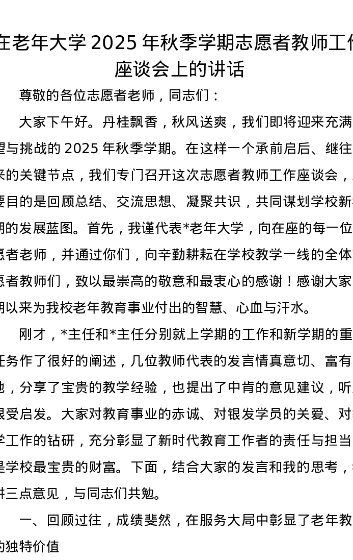 在老年大学2025年秋季学期志愿者教师工作座谈会上的讲话