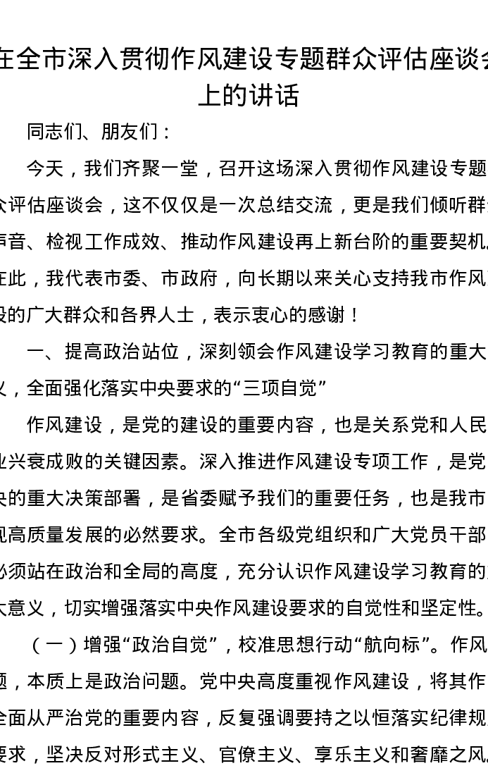 在全市深入贯彻作风建设专题群众评估座谈会上的讲话
