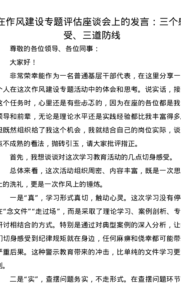 在作风建设专题评估座谈会上的发言:三个感受、三道防线