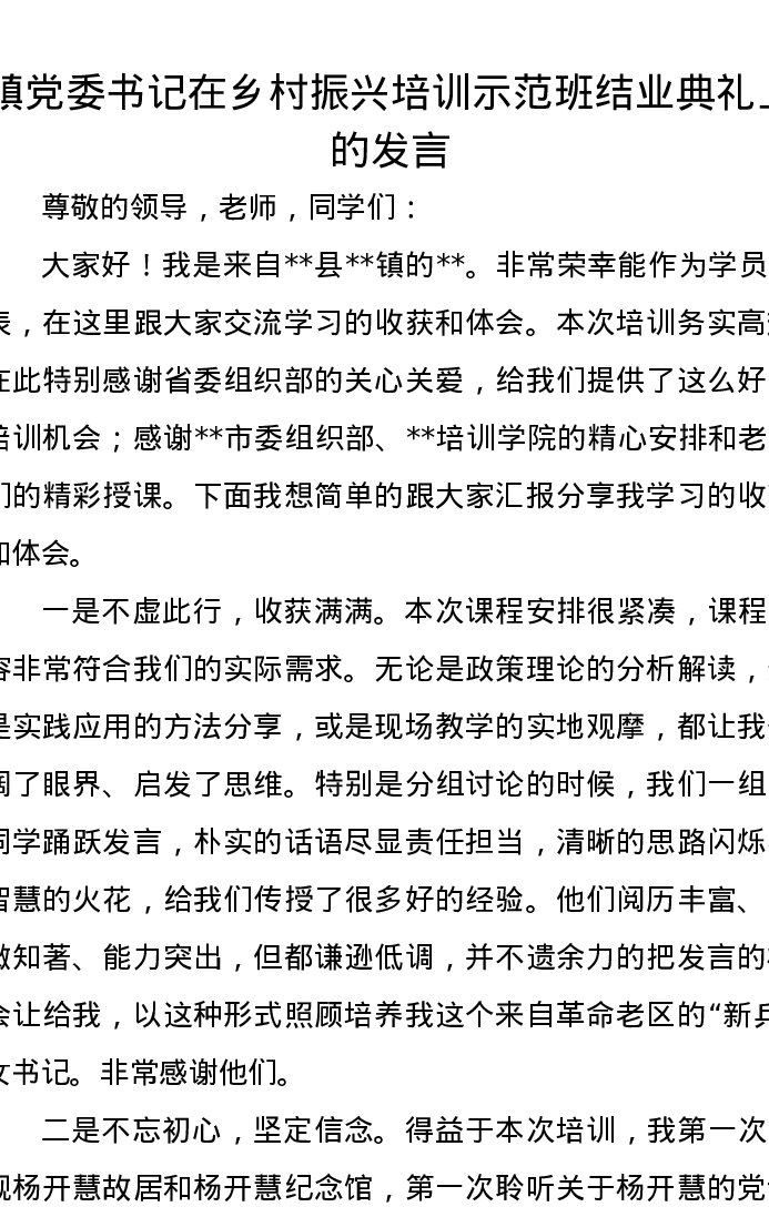 镇党委书记在乡村振兴培训示范班结业典礼上的发言