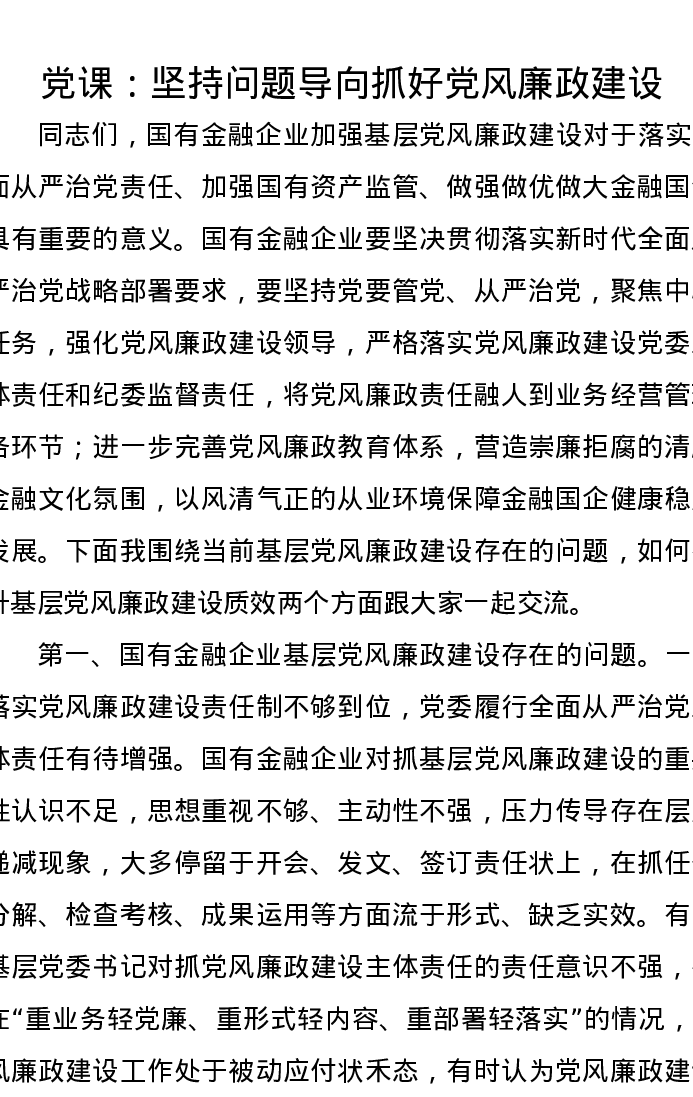 党课讲稿:坚持问题导向 抓好党风廉政建设(金融国企)