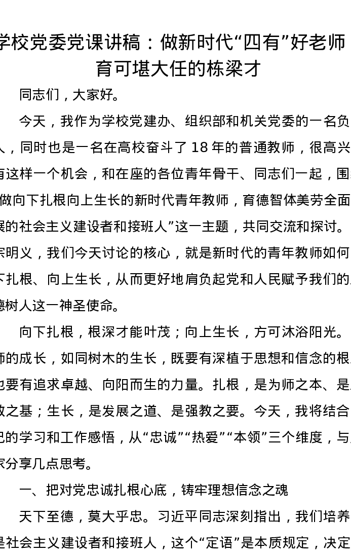 学校党委党课讲稿:做新时代“四有”好老师,育可堪大任的栋梁才
