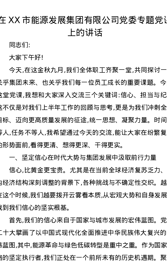 在XX市能源发展集团有限公司党委专题党课上的讲话