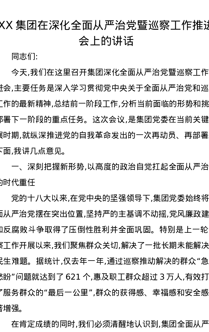 XX集团在深化全面从严治党暨巡察工作推进会上的讲话