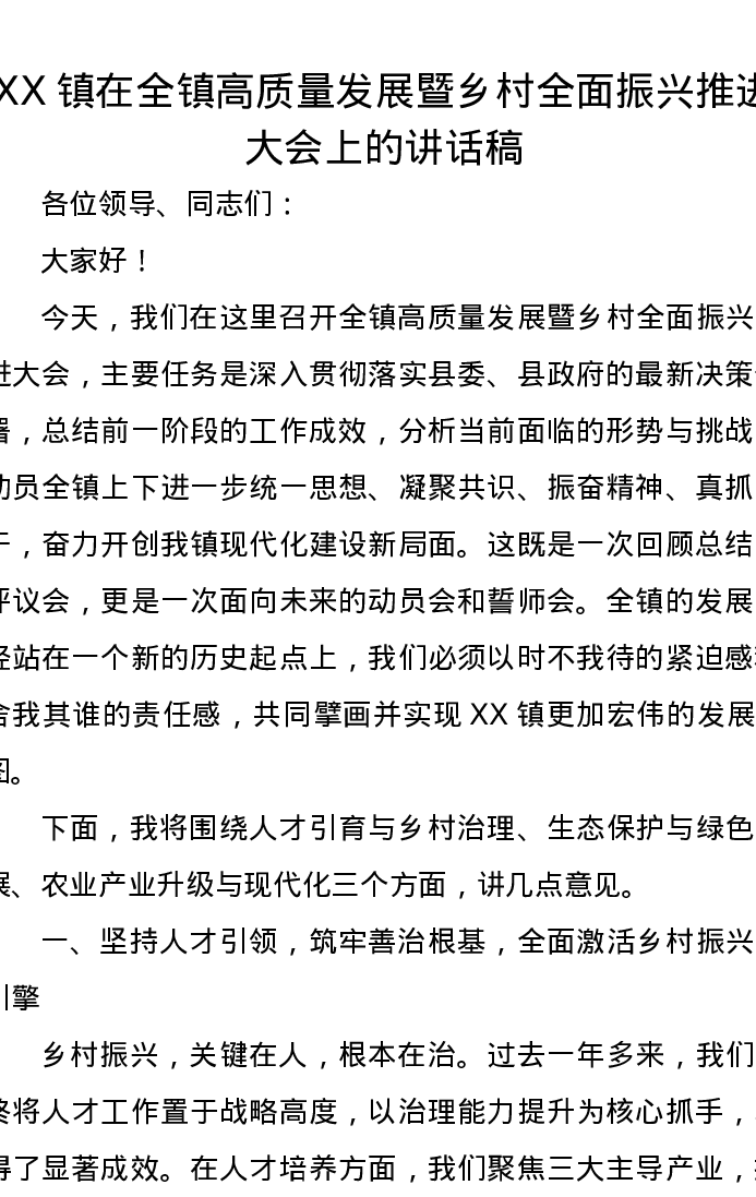 XX镇在全镇高质量发展暨乡村全面振兴推进大会上的讲话稿